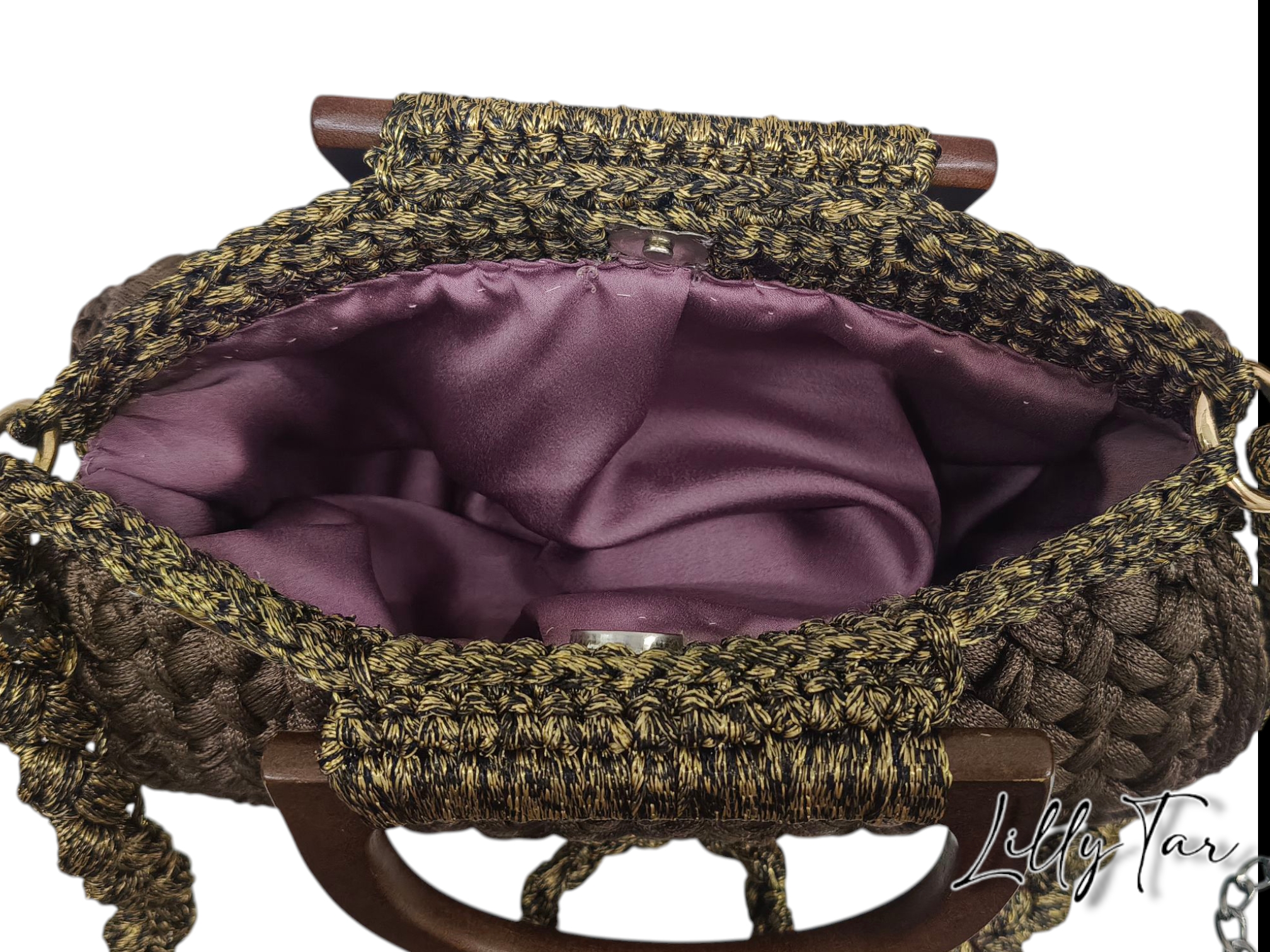 Un connubio perfetto di natura e glamour: questa borsa, realizzata con resistente cordino rocca, è arricchita da eleganti dettagli e laterali in cordino laminato che catturano la luce. I manici in legno naturale aggiungono un tocco rustico-chic. Stile unico, materiali pregiati e un tocco di luce per te!