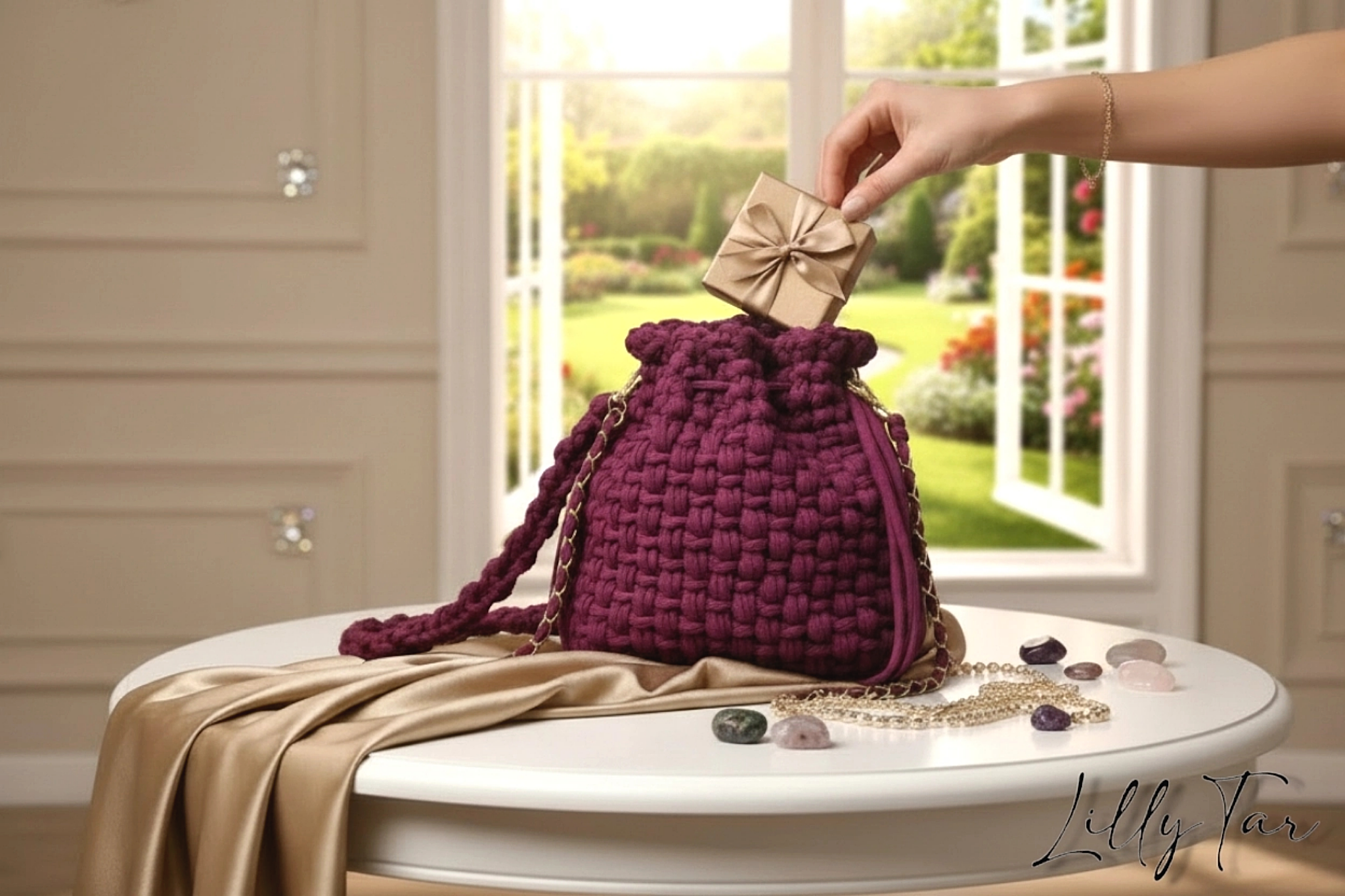 Esplora l’eleganza con la nostra borsa “Amethyst”, realizzata a mano in fettuccia di alta qualità. Il suo ricco colore e i dettagli in catena dorata aggiungono un tocco di glamour a ogni outfit. La chiusura a coulisse conferisce un fascino unico e pratico. Un accessorio che parla di stile e originalità. Aggiungila al tuo carrello e porta a casa un pezzo di artigianato italiano!