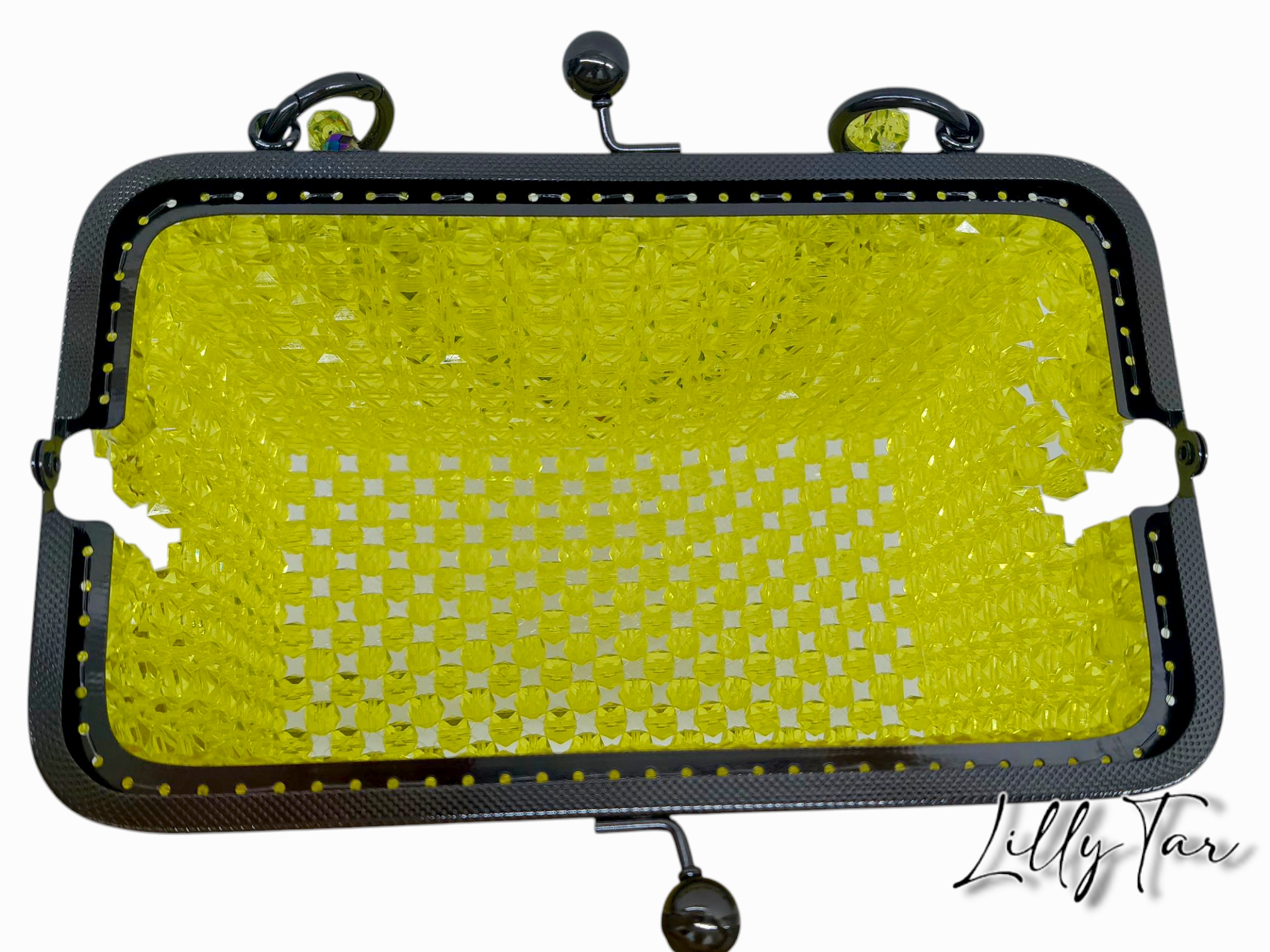Abbraccia la luce con questa borsa unica! Realizzata con perline acriliche quadrate giallo sole, cattura ogni raggio di luce per un effetto abbagliante. Il manico, arricchito da scintillanti cristalli, aggiunge un tocco di lusso che non passerà inosservato. Un accessorio audace e raffinato, perfetto per brillare in ogni occasione!