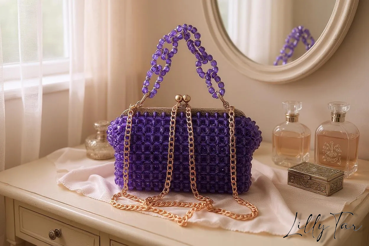 Scopri l’eleganza senza tempo con questa borsa unica, realizzata a amano con perline quadrate viola scintillanti. La chiusura clic clac dorata aggiunge un tocco vintage e sofisticato, mentre la tracolla a catena completa il look perfetto per le tue serate speciali. Un accessorio raffinato che cattura ogni sguardo!