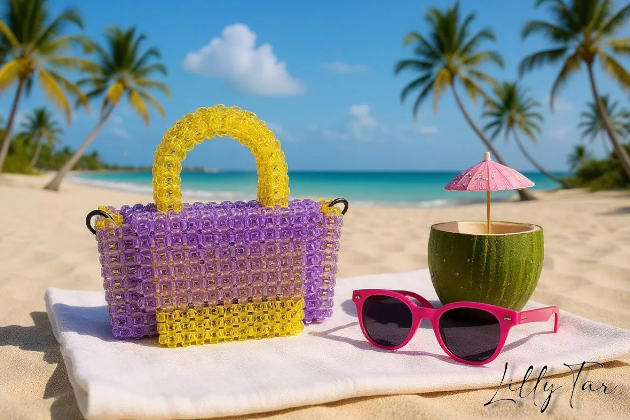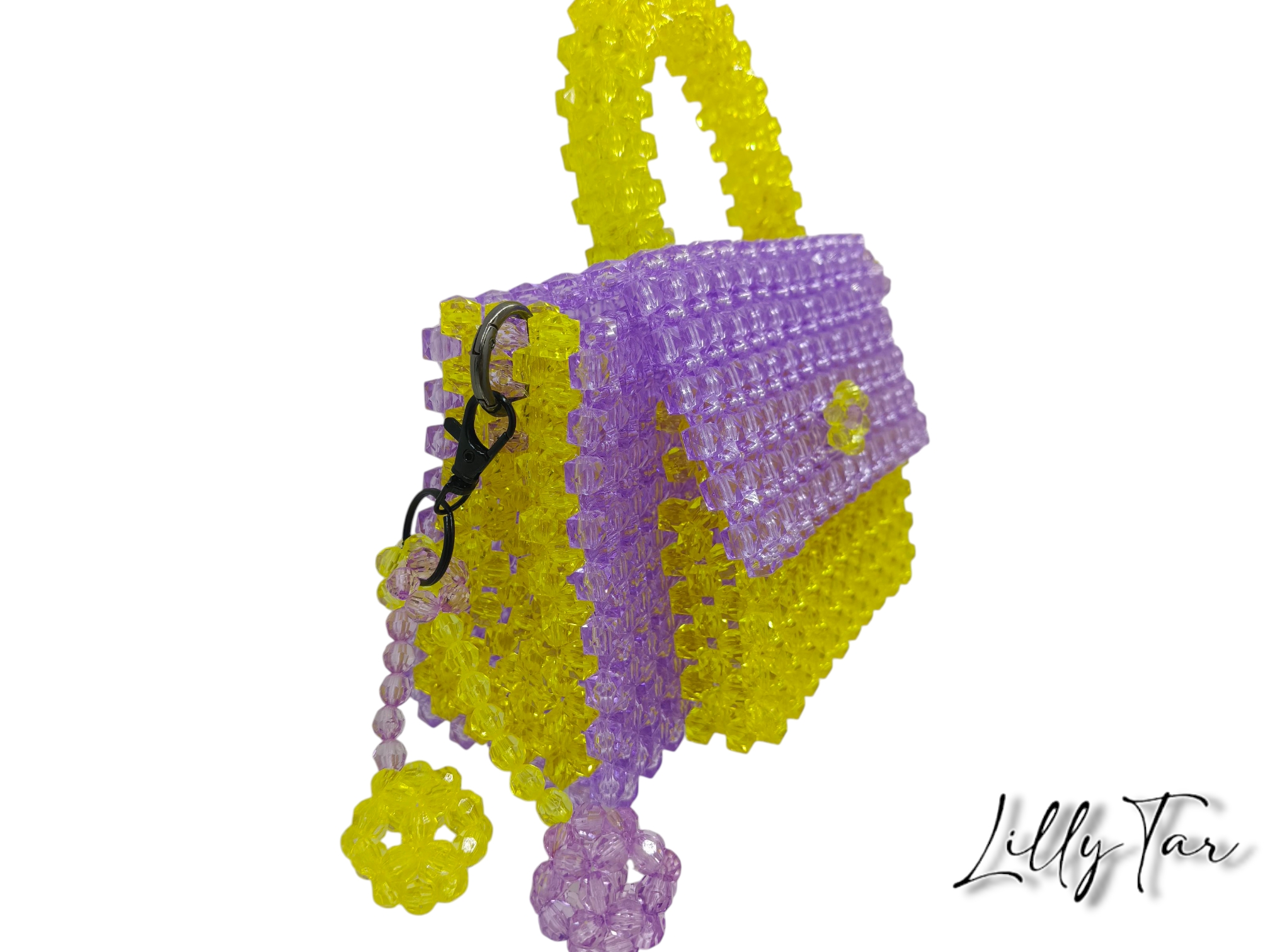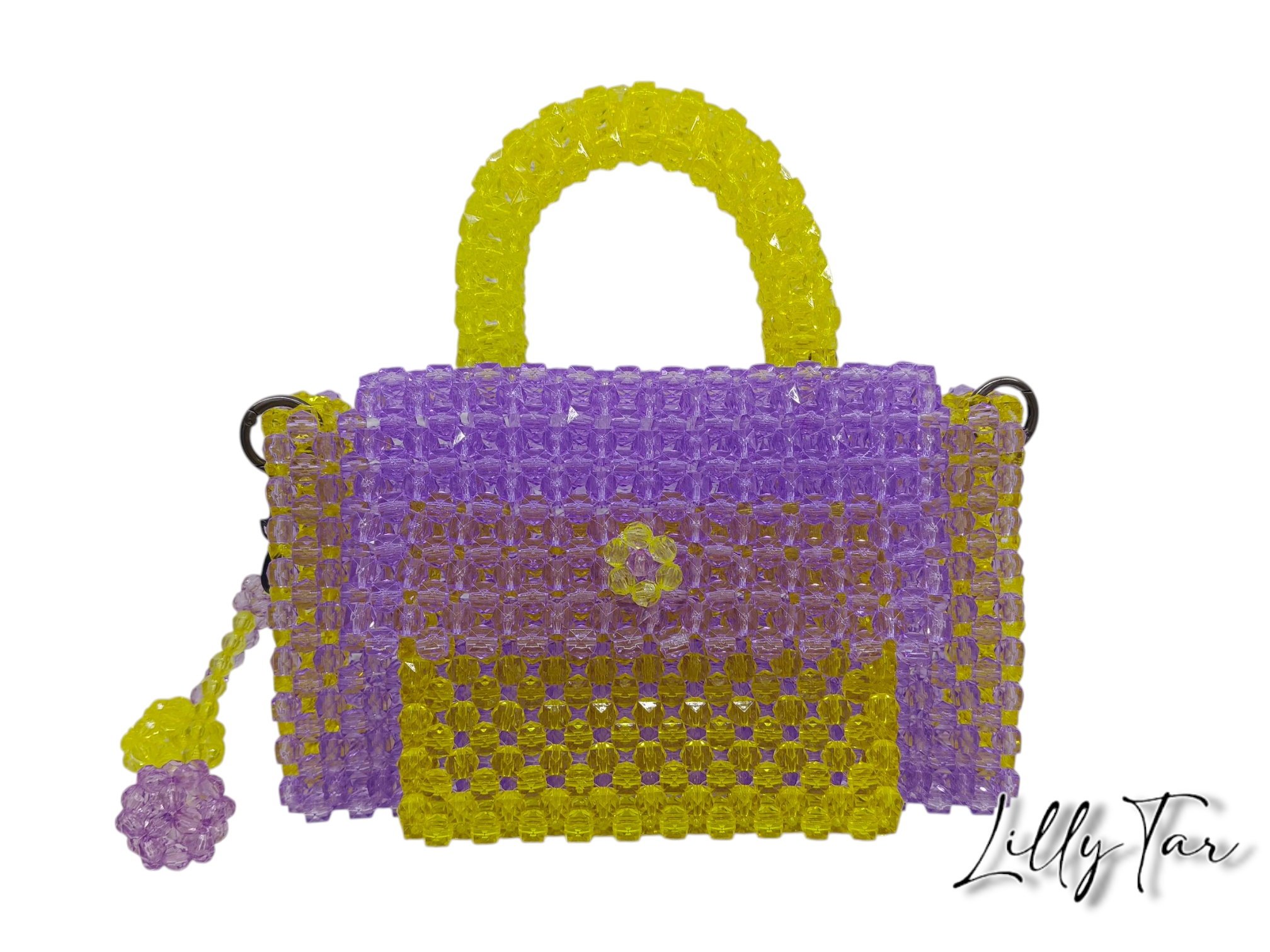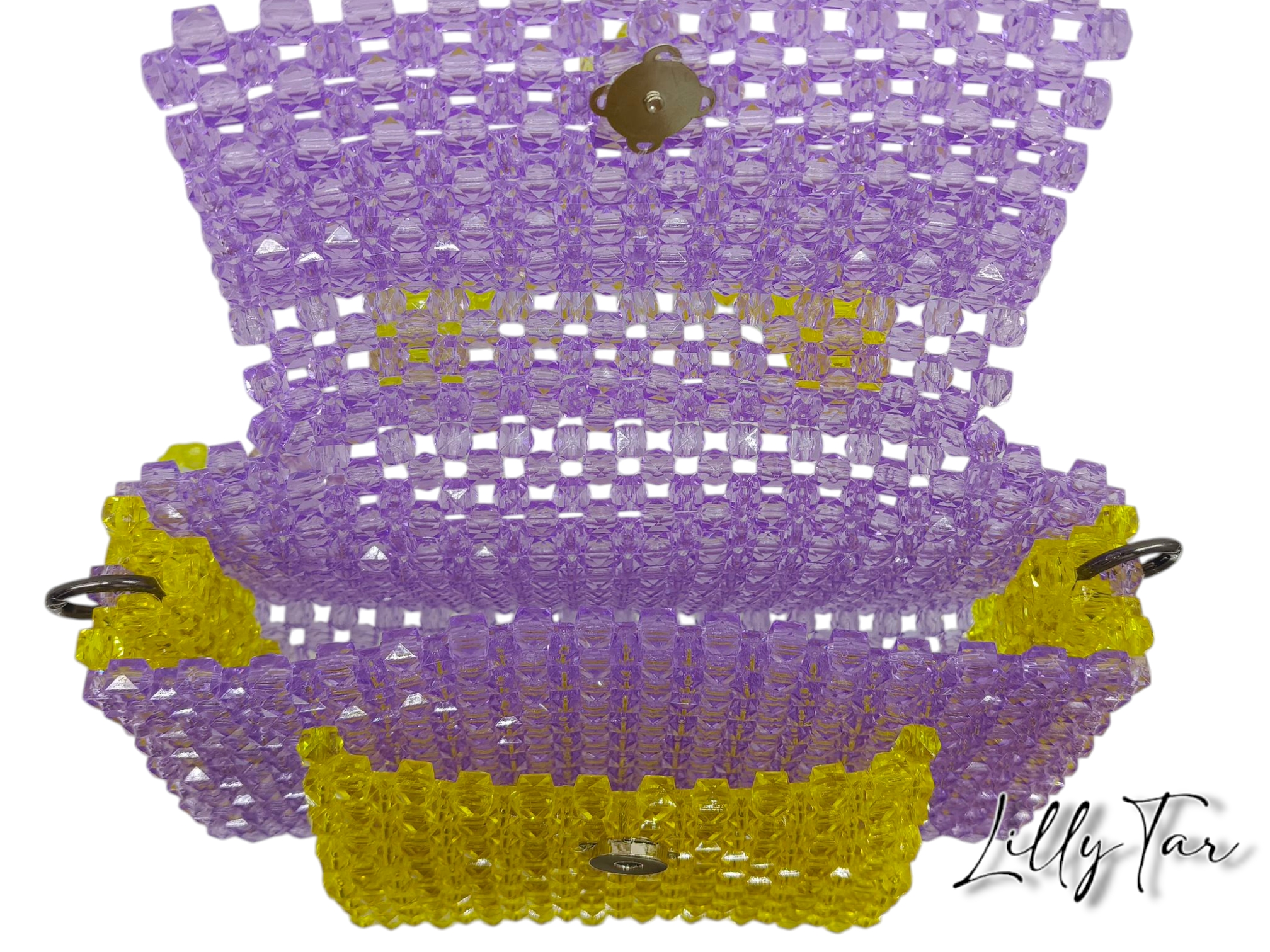 Porta con te l’energia dell’estate con questa splendida borsa! Realizzata con perline acriliche quadrate che sfumano dal giallo solare al viola brillante, è un vero raggio di sole. La pratica tasca frontale è perfetta per avere sempre a portata di mano ciò che ti serve. Un accessorio allegro e funzionale, ideale per le tue giornate all’insegna dello stile !