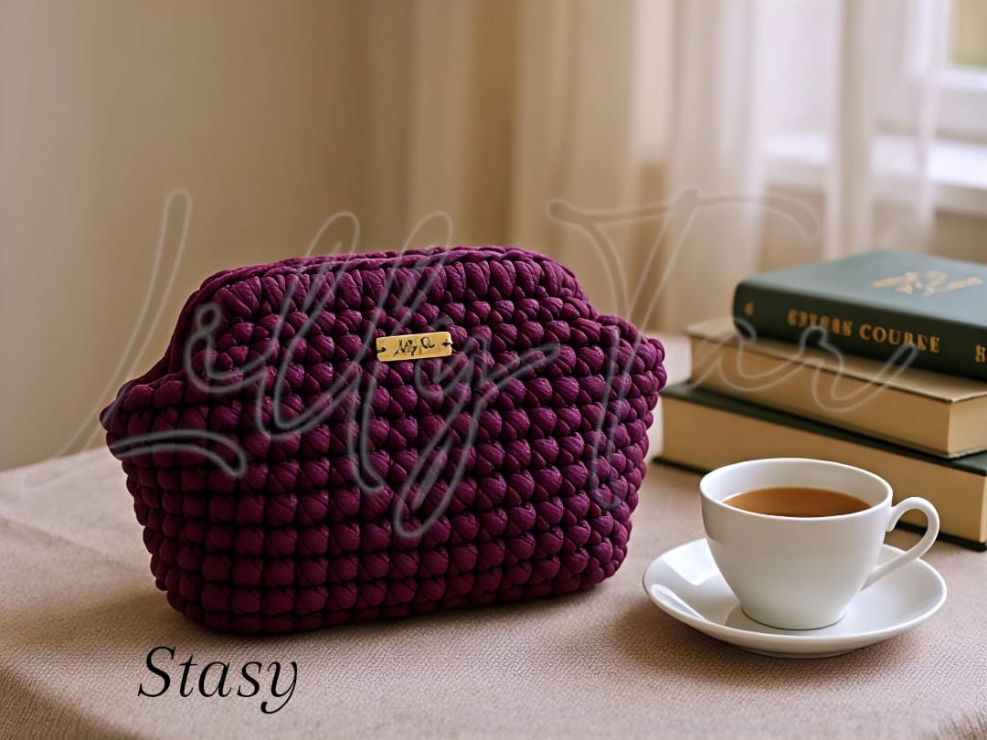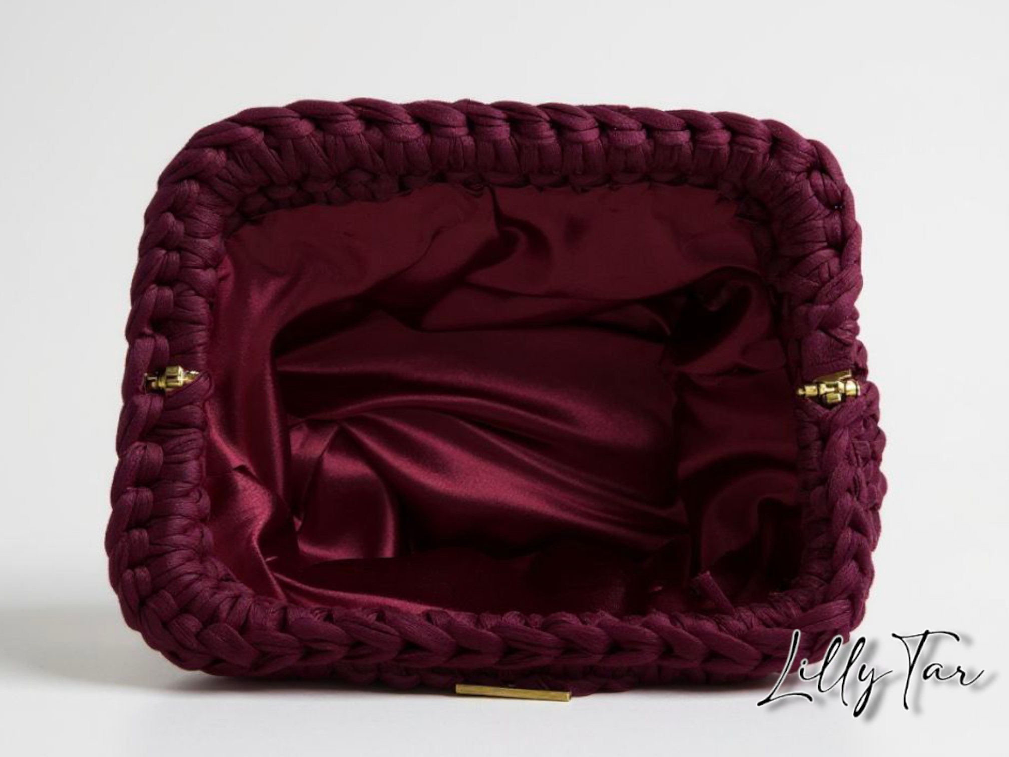 Immergiti nella morbidezza lussuosa e nella texture avvolgente di questa magnifica clutch, creata artigianalmente con fettuccia. Ogni punto del crochet è un dettaglio di maestria, che conferisce alla borsa un carattere unico e ricercato. Il colore profondo aggiunge un tocco di sofisticata audacia, perfetto per elevare ogni tuo look, dal casual chic all’elegante.